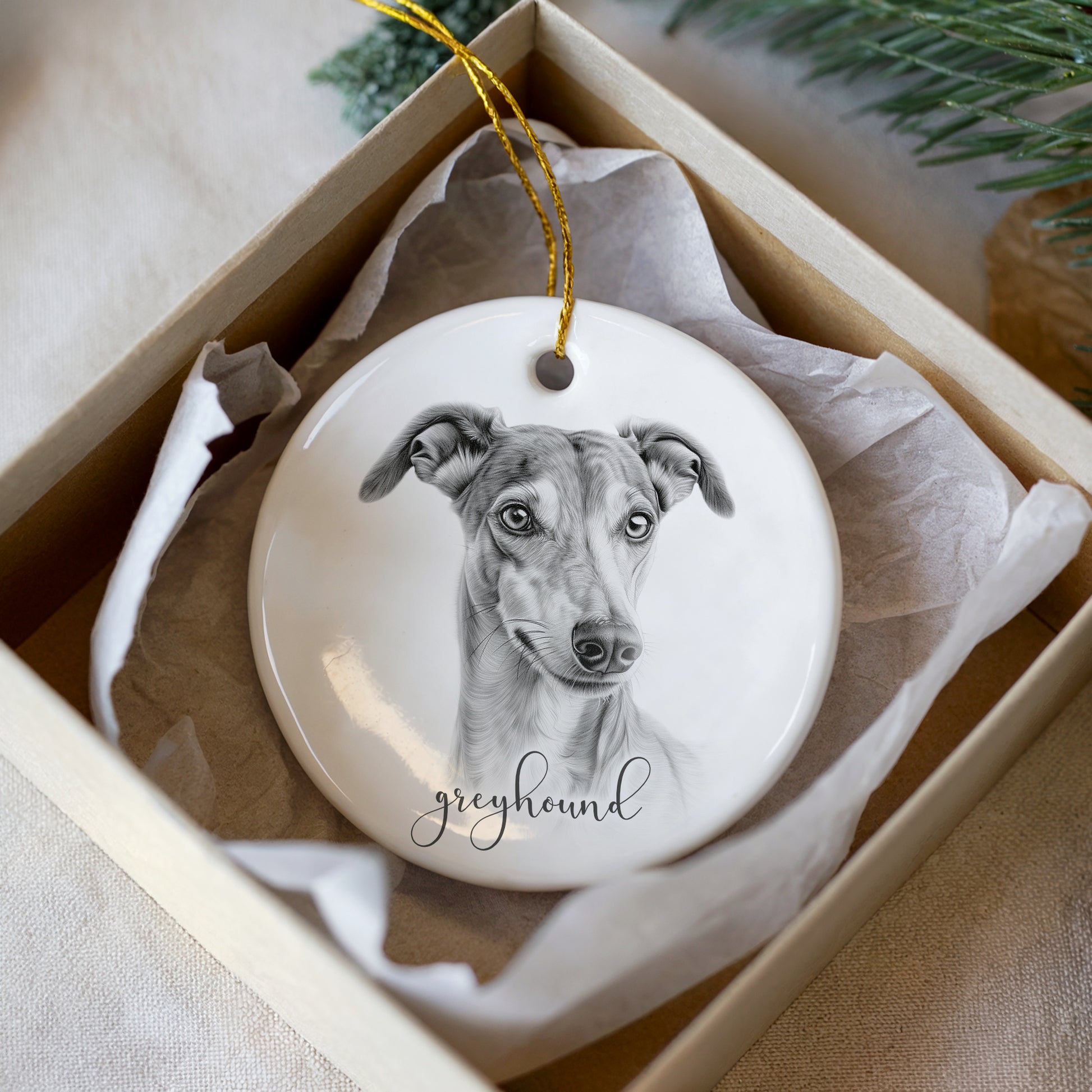 This beautiful 7cm white gloss finish ceramic bauble will make the perfect memorable keepsake this year. A great addition to the Christmas tree and include your Greyhound!