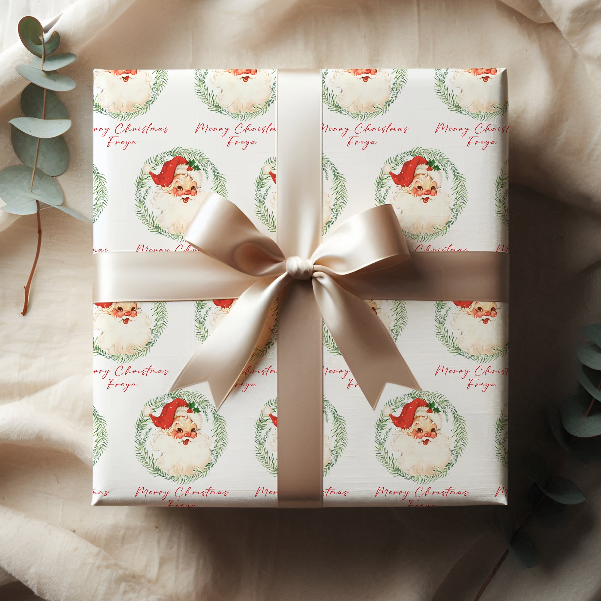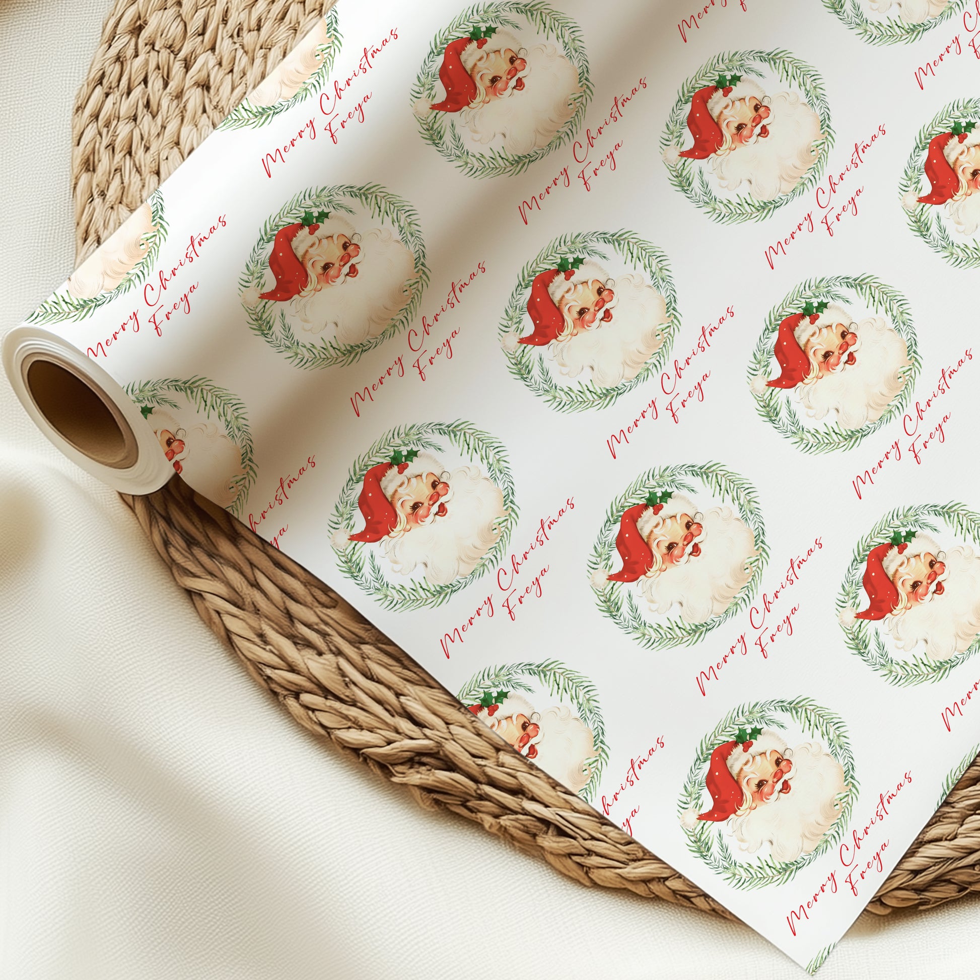 Make your gifting extra special with this personalised Retro Santa Christmas wrapping paper.